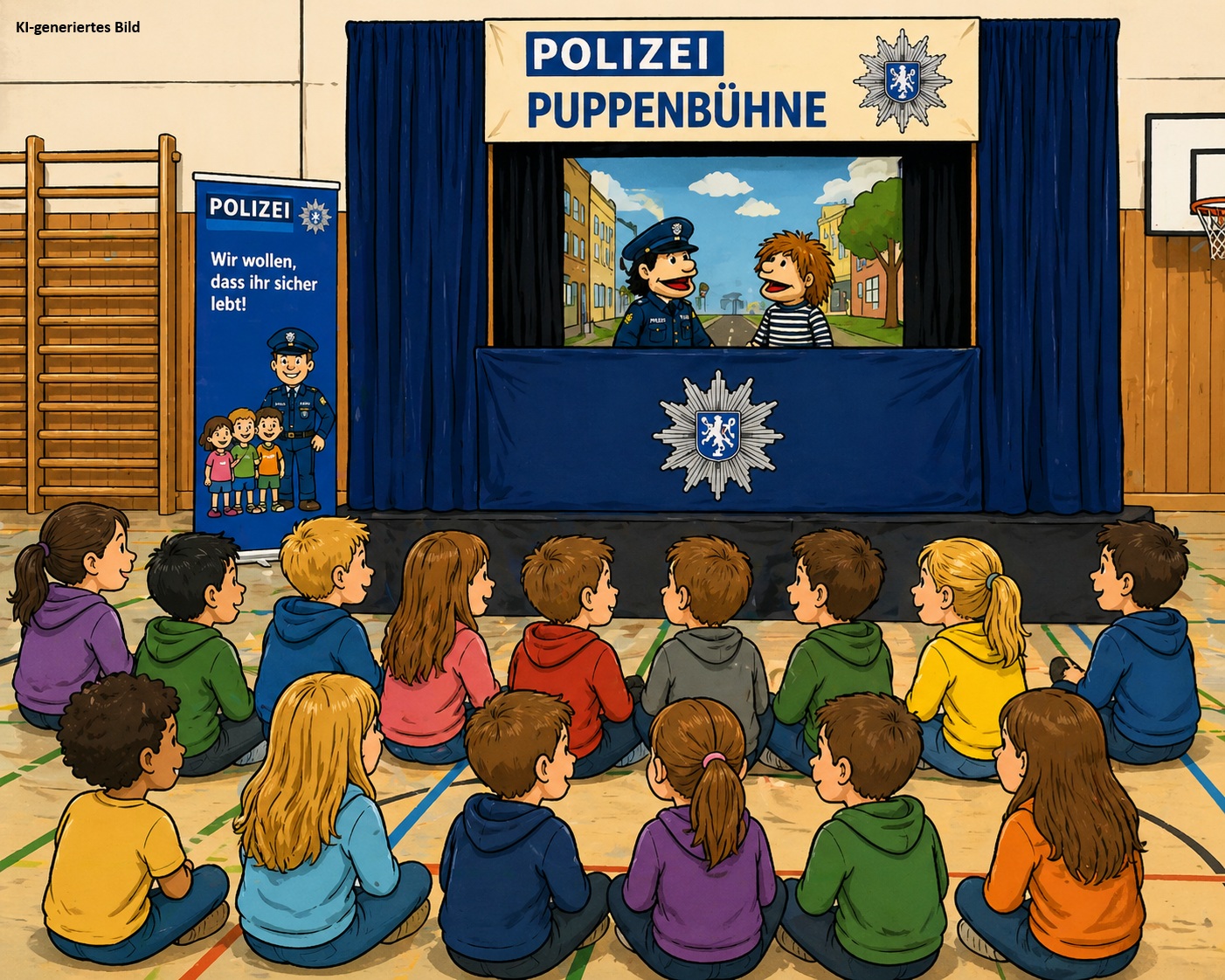 Am Donnerstag, den 09.04.2026 waren eine Polizistin, ein Polizist und zwei Mitarbeiterinnen der PäPP WHV (Pädagogische Puppenbühne der Polizei Wilhelmshaven) bei uns in der Schule. In der Turnhalle erzählten sie uns etwas über Medien und spielten uns das Puppentheaterstück „Datensammler“ vor.