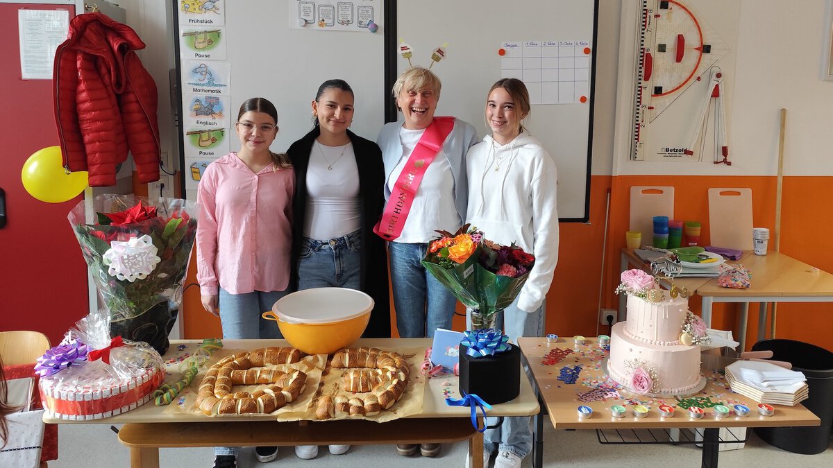 Der Klassenraum war festlich geschmückt. Ein gedeckter Tisch erwartete Frau Jäger mit einer prächtigen Torte, während frisches, duftendes Brot für die vierte Klasse bereitlag. Konfetti glitzerte auf den Tischen, und die Vorfreude war allen Anwesenden im Gesicht geschrieben.