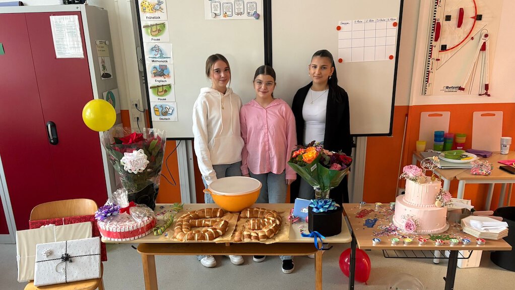 Dilay , Perihan und Dilek drei ehemalige Schülerinnen hatten sich zusammengetan, um Frau Jäger mit einer nachträglichen Geburtstagsfeier im Klassenraum zu überraschen, zusammen mit der derzeitigen vierten Klasse. Mit Unterstützung von Tante Düdü, die mit ihrem fröhlichen Wesen die Stimmung noch heller machte, war alles perfekt vorbereitet worden.